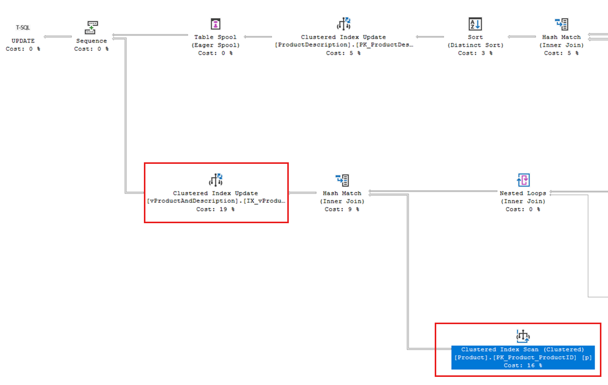This index scan is being performed because our update query needs to modify an indexed view named vProductAndDescription. As mentioned in the Look for patterns that increase blocking section of this article, indexed views referencing multiple tables could increase blocking and the likelihood of deadlocks.