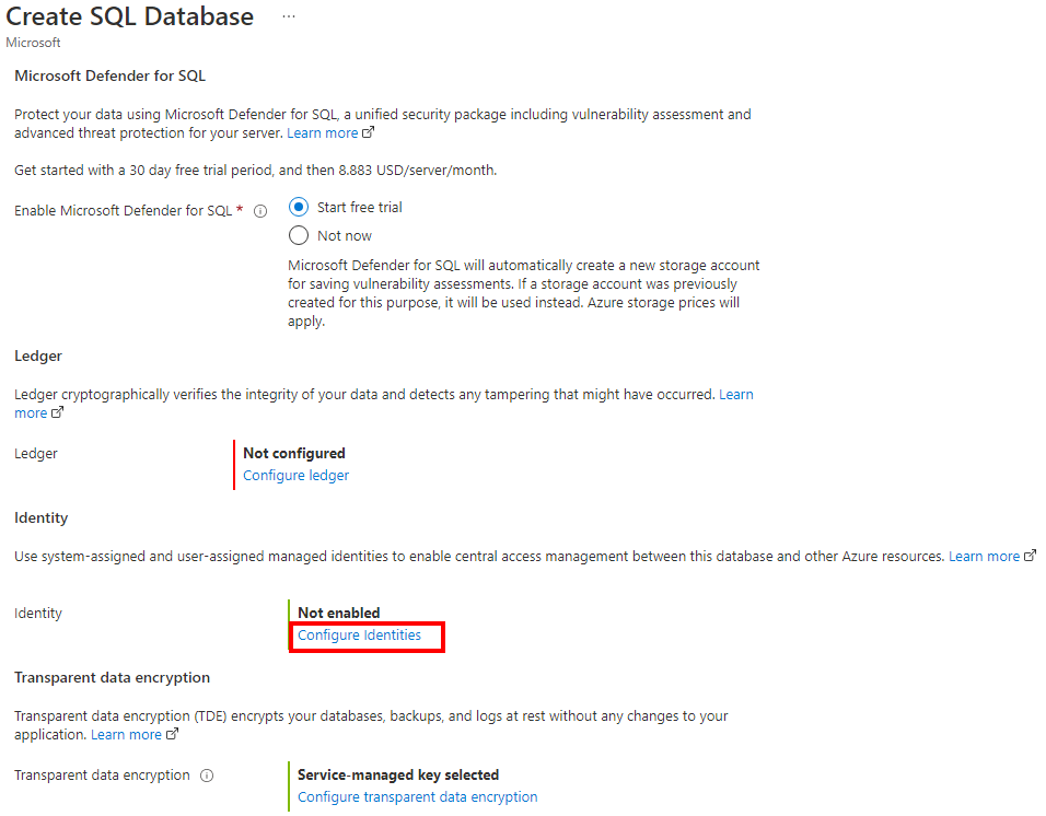 The following steps outline the process of creating a new Azure SQL Database logical server and a new database with a user-assigned managed identity assigned.