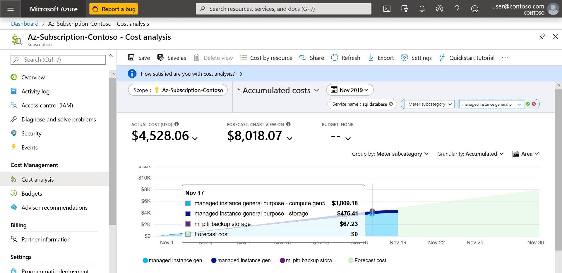 To understand backup storage costs, go to Cost Management + Billing in the Azure portal. Select Cost Management, and then select Cost analysis. Select the desired subscription for Scope, and then filter for the time period and service that you're interested in as follows: