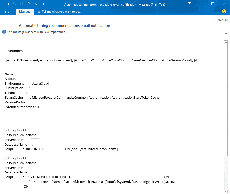 Screenshot from Microsoft Outlook of a sample email output from automatic tuning email notifications.