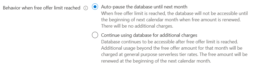 - To maintain access to the database when limits are reached, which results in charges for any amount above the free offer vCore and storage size limits, select the Continue using database for additional charges option. You only pay for any usage over the free offer limits.