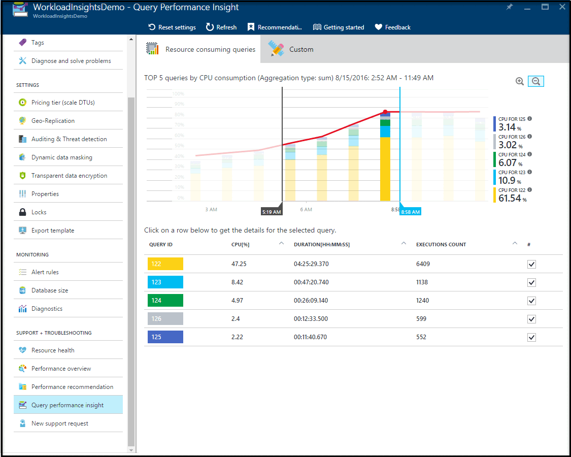 Query performance insight allows you to see a history of the top resource-consuming queries and long-running queries for a specific database. You can quickly identify TOP queries by resource utilization, duration, and frequency of execution. You can track queries and detect regression. This feature requires Query Store to be enabled and active for the database.