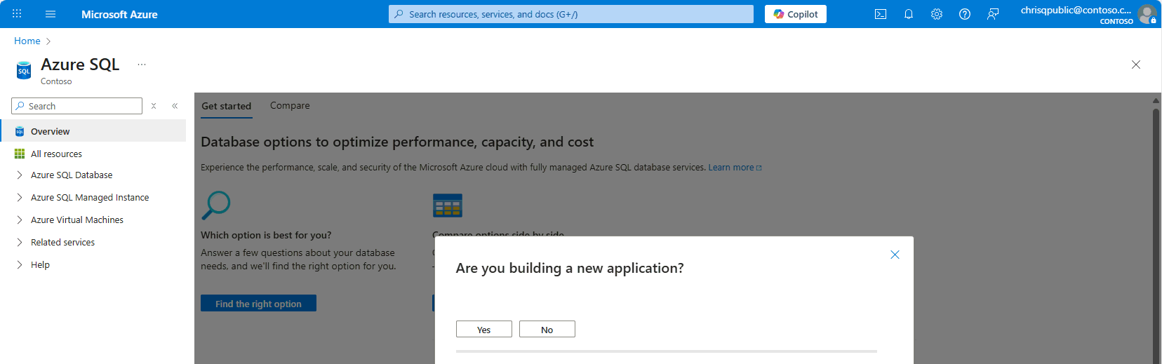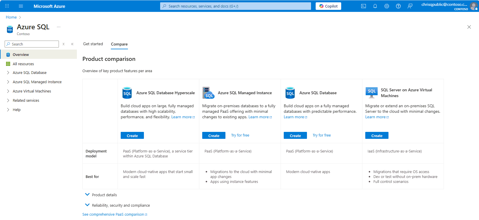 The Azure SQL hub is the launching point for Azure SQL Database, Azure SQL Database Hyperscale, Azure SQL Managed Instance, and SQL Server on Azure Virtual Machines.