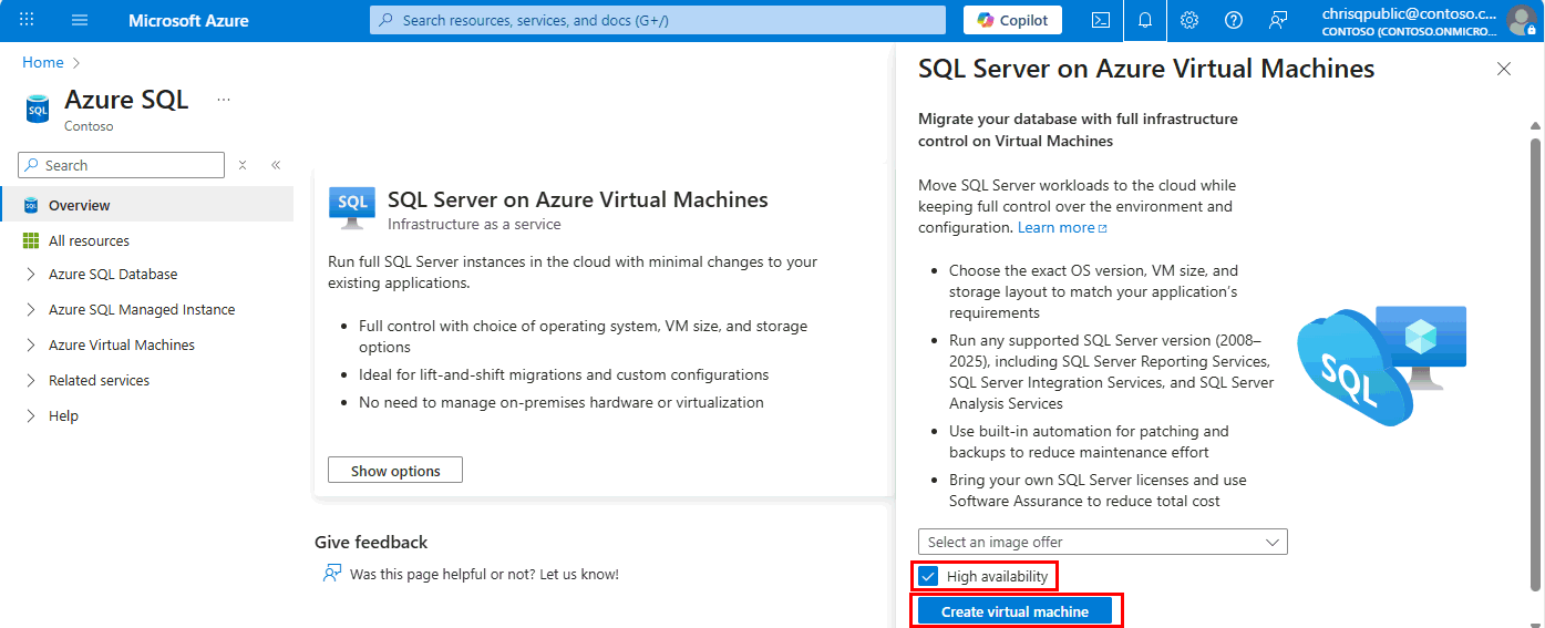 In the Select an image offer box, choose a SQL Server image (such as Free SQL Server License: SQL Server 2025 Enterprise Developer on Windows Server 2025).