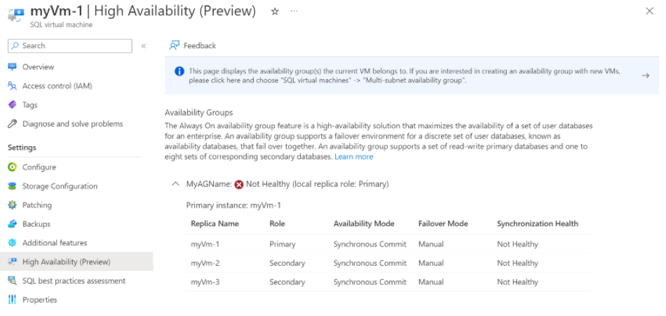 After the deployment finishes, you can browse to the SQL virtual machines resource in the portal. Under Settings, select High Availability to monitor the health of the availability group. Select the arrow next to the name of your availability group to see a list of all replicas.