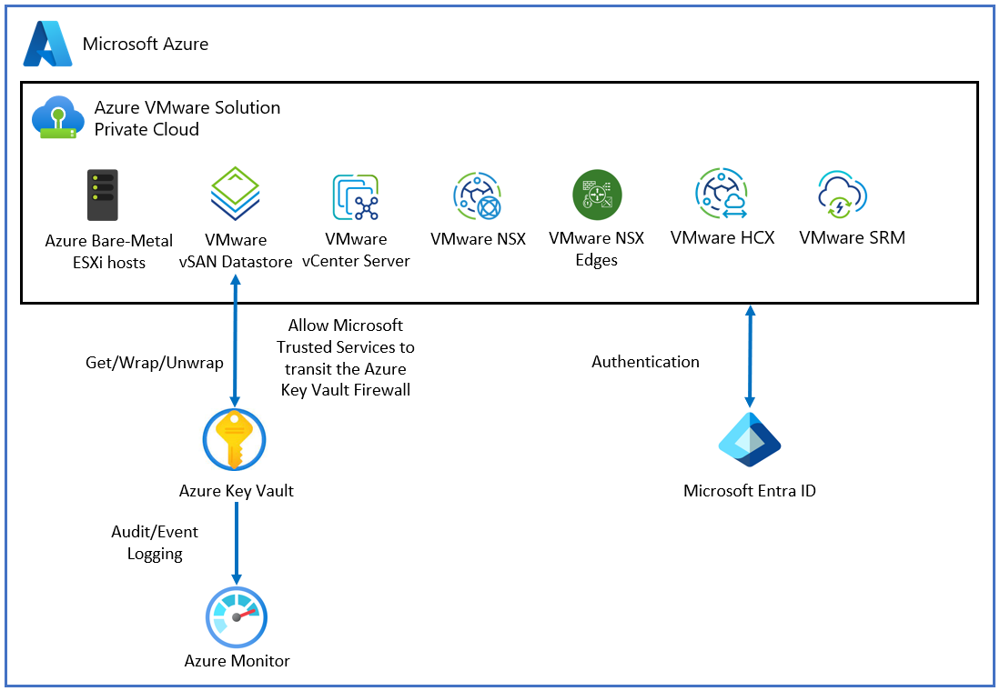 The following diagram shows how Azure VMware Solution uses Microsoft Entra ID and a key vault to deliver the CMK.