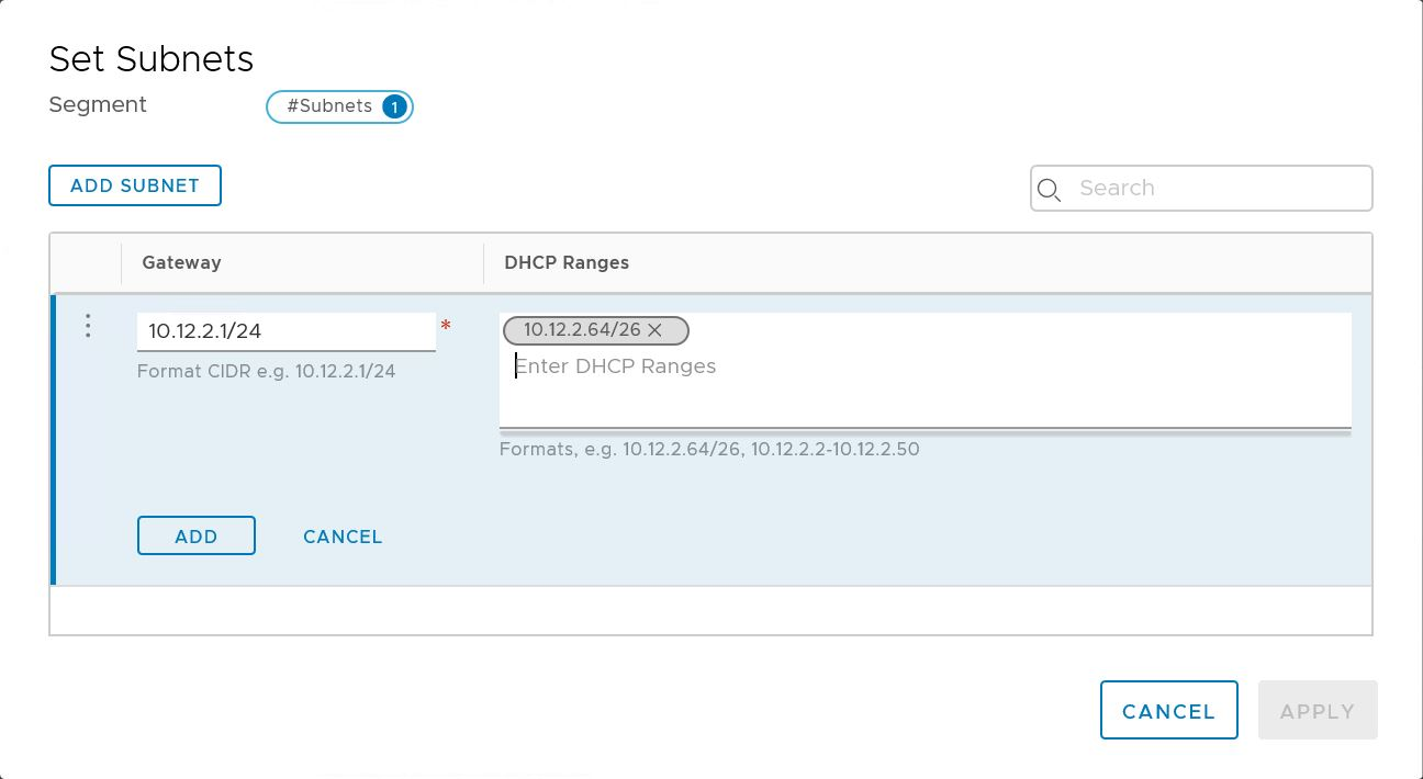 Complete the DHCP configuration by providing DHCP ranges on the logical segments and then select OK.