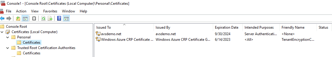 In the Certificates (Local Computer) management console, expand the Personal folder and select the Certificates folder to view the installed certificates.