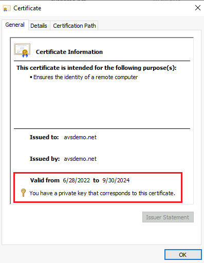 Double-click the certificate for LDAPS. Ensure that the certificate date Valid from and Valid to is current and that the certificate has a private key that corresponds to the certificate.