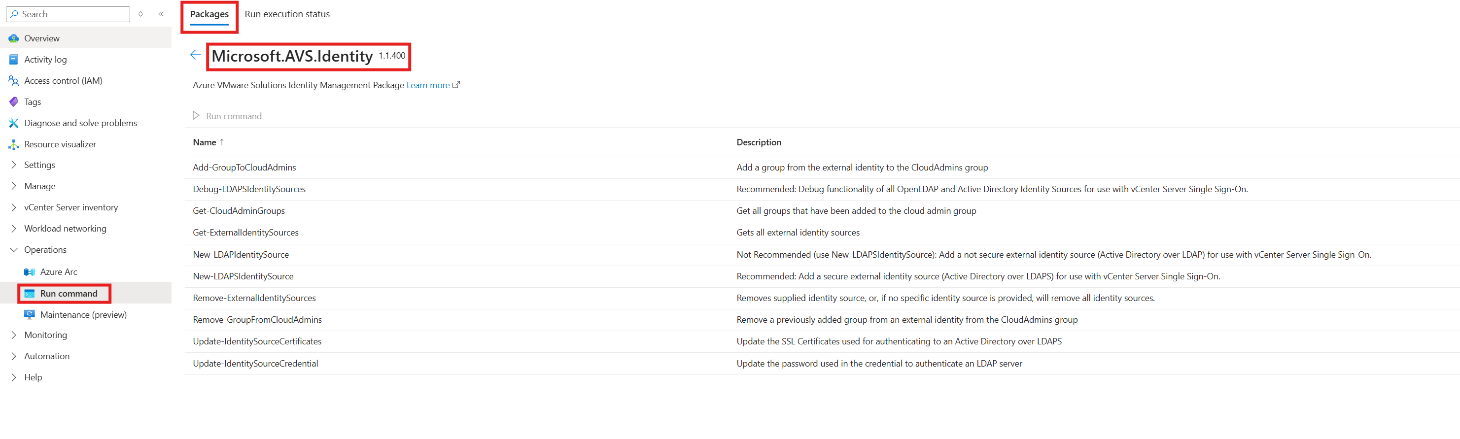 <https://portal.azure.us/>.Select Run command > Packages > Microsoft.AVS.Identity > Get-ExternalIdentitySources.