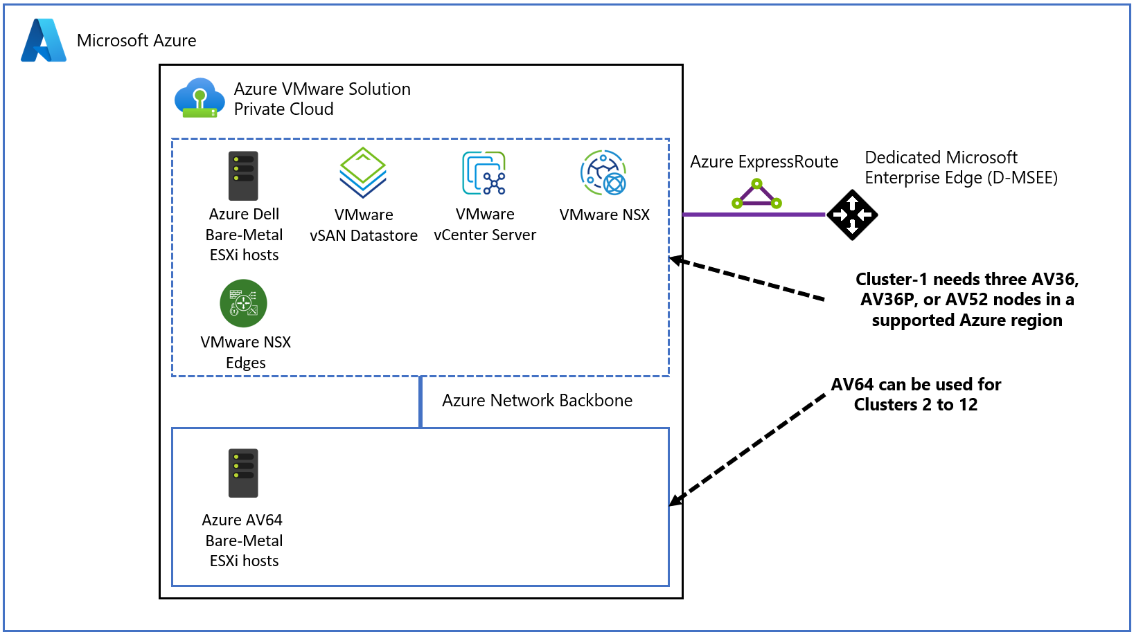 Customer with existing Azure VMware Solution private cloud: When a customer has a deployed Azure VMware Solution private cloud, they can scale the private cloud by adding a separate AV64 vCenter node cluster to that private cloud. In this scenario, customers should use the following steps: