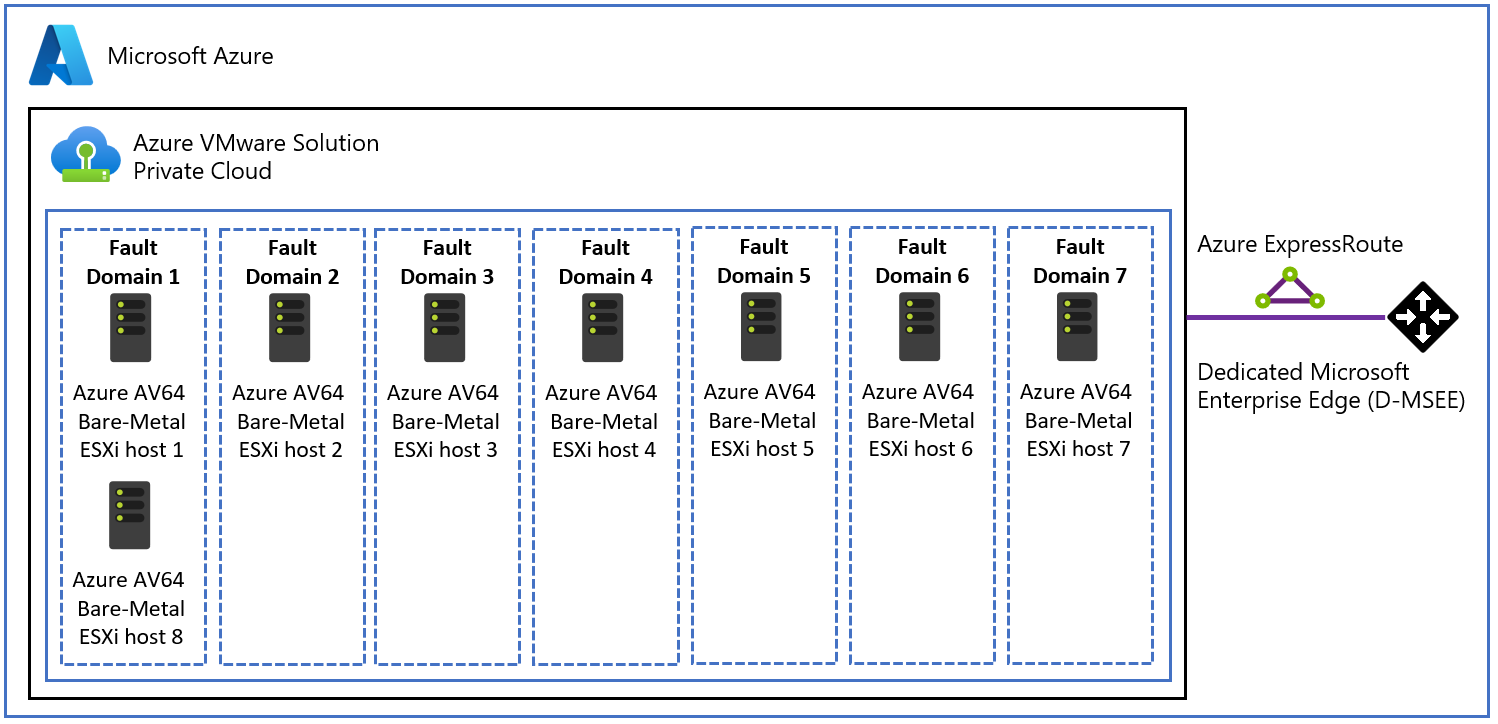 Azure VMware Solution Generation 1 provides VMware vSphere clusters built from dedicated bare-metal hosts deployed in Azure data center facilities. Microsoft-managed ExpressRoute circuits provide connectivity between VMware vSphere hosts and native Azure resources deployed in Virtual Networks.
