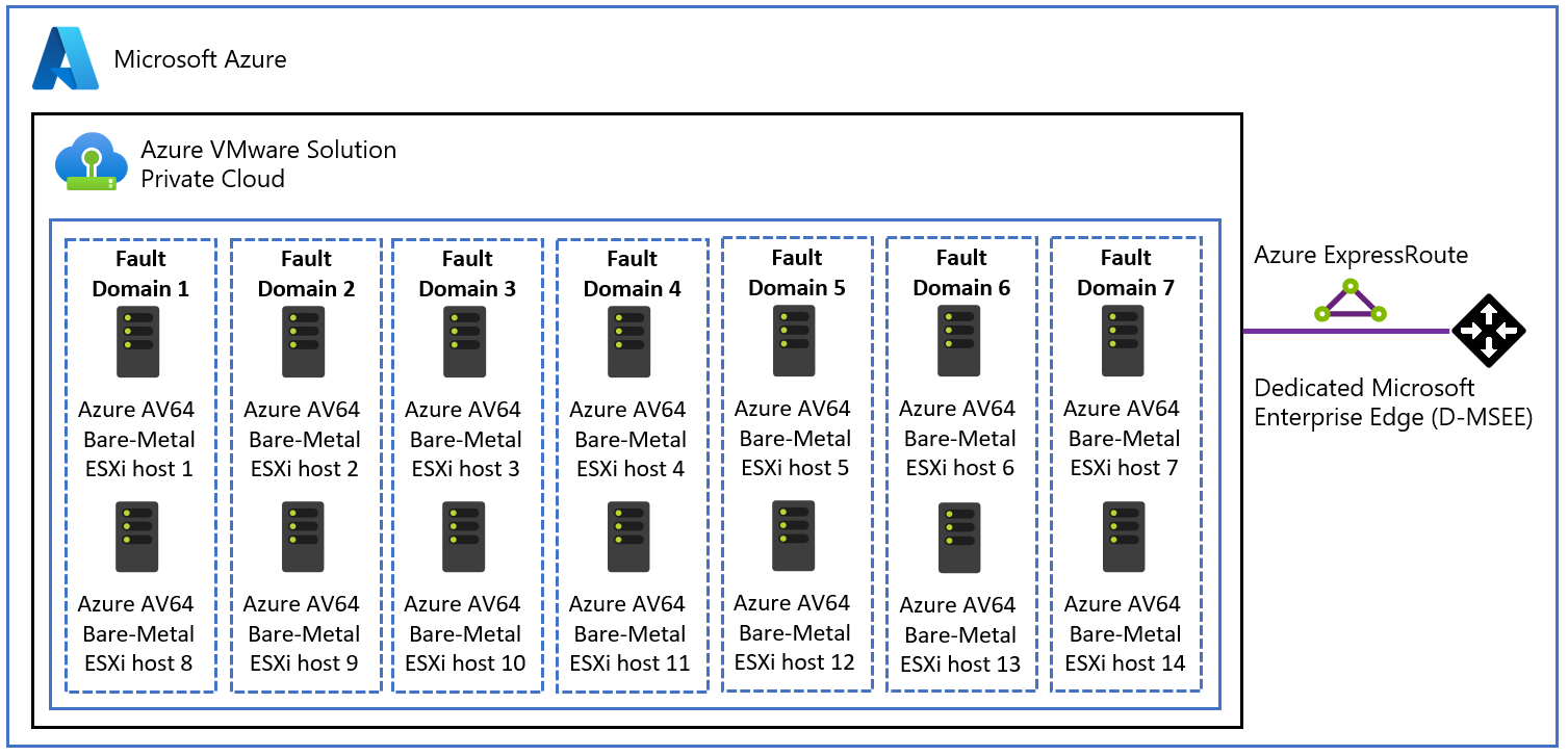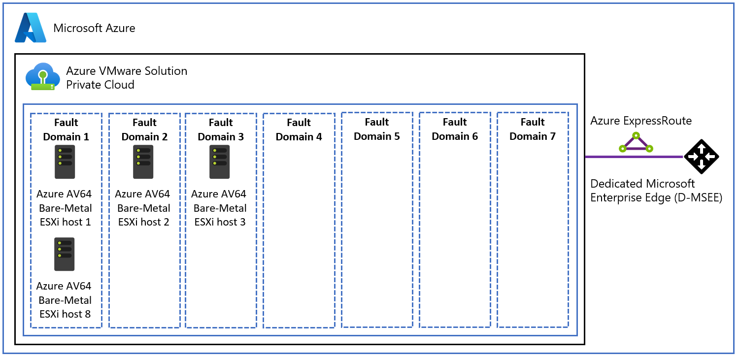 The Azure VMware Solution AV64 host clusters have an explicit vSAN fault domain (FD) configuration. Azure VMware Solution control plane configures seven vSAN fault domains (FDs) for AV64 clusters. Hosts are balanced evenly across the seven FDs as users scale up the hosts in a cluster from three nodes to 16 nodes. Some Azure regions still support a maximum of five FDs as part of the initial release of the AV64 SKU. Refer to the Azure region availability zone to host type mapping table for more information.