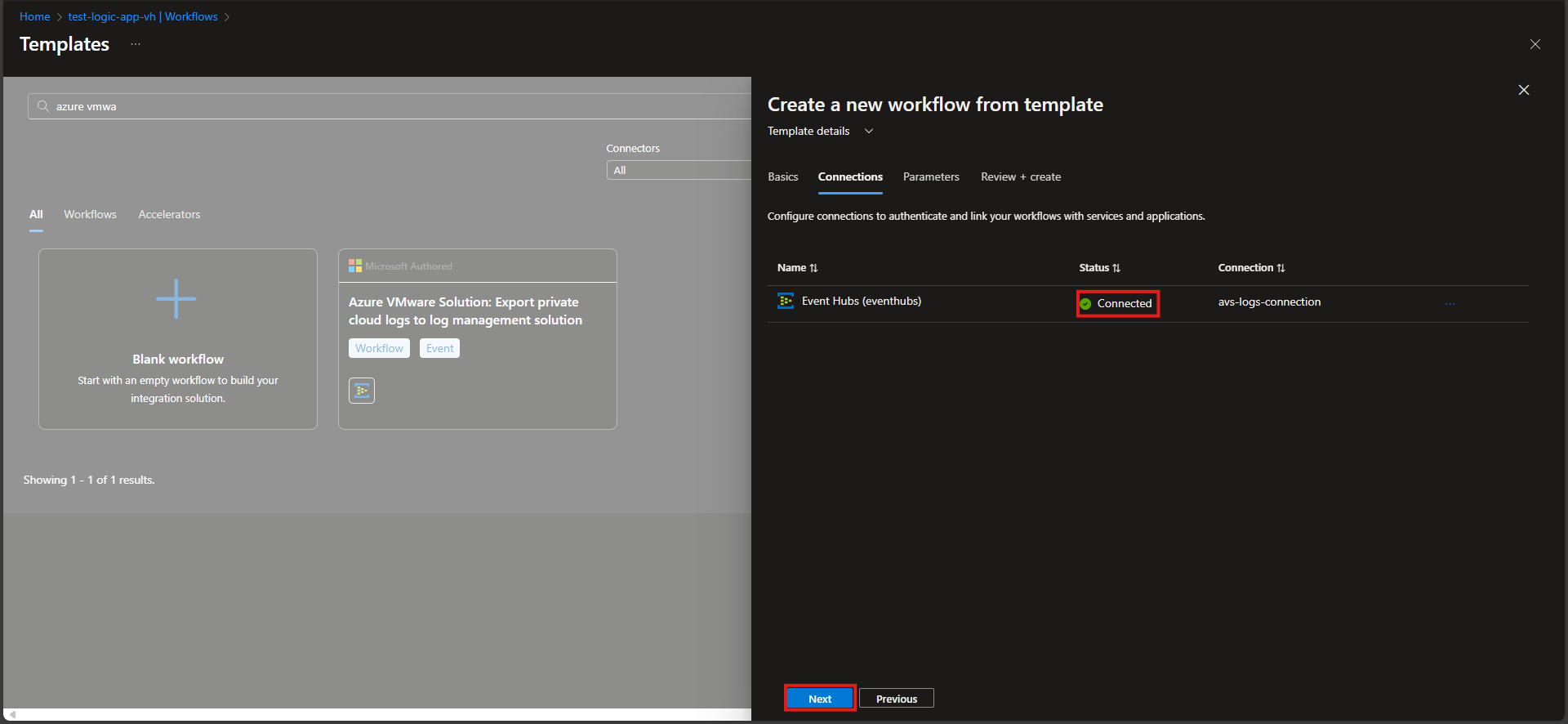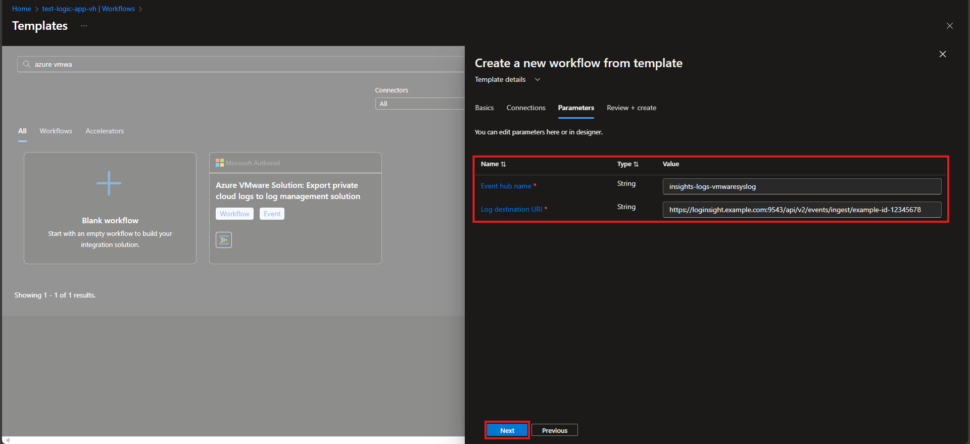 - Review the information provided, then click Create. This action saves the workflow that can be used to send the log messages from Azure VMware Solution to any syslog endpoint.