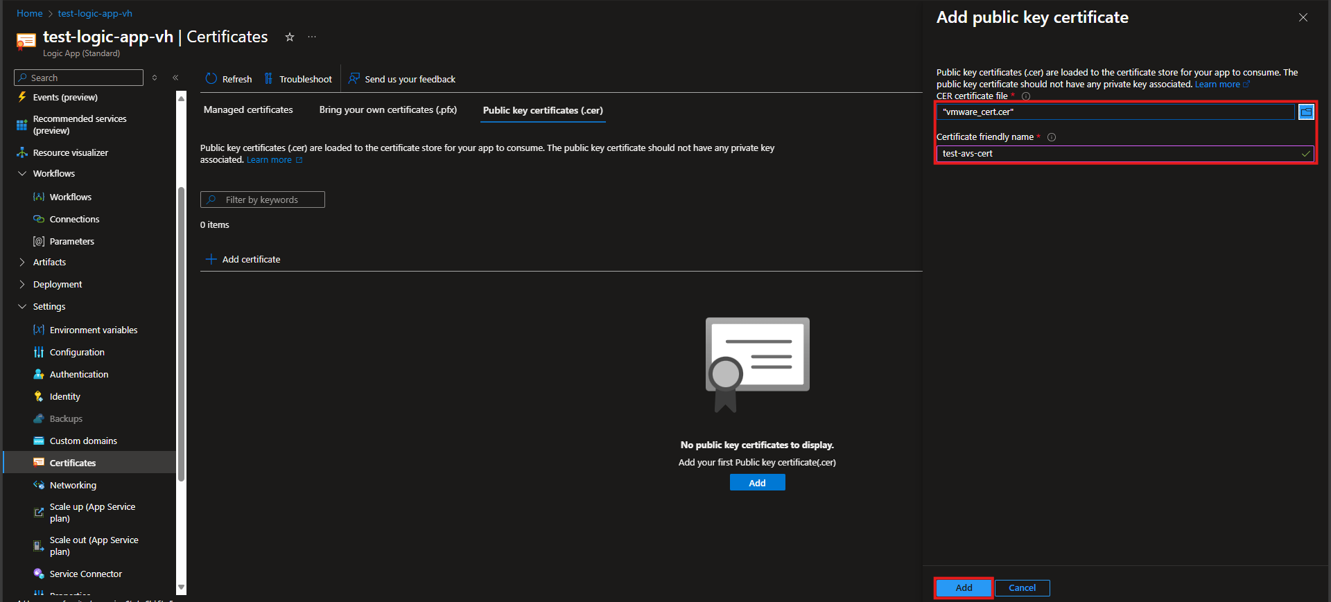 In the Azure Logic App, navigate to Settings > Certificates. Navigate to the tab that says Public key certificates (.cer) and click on Add certificate.