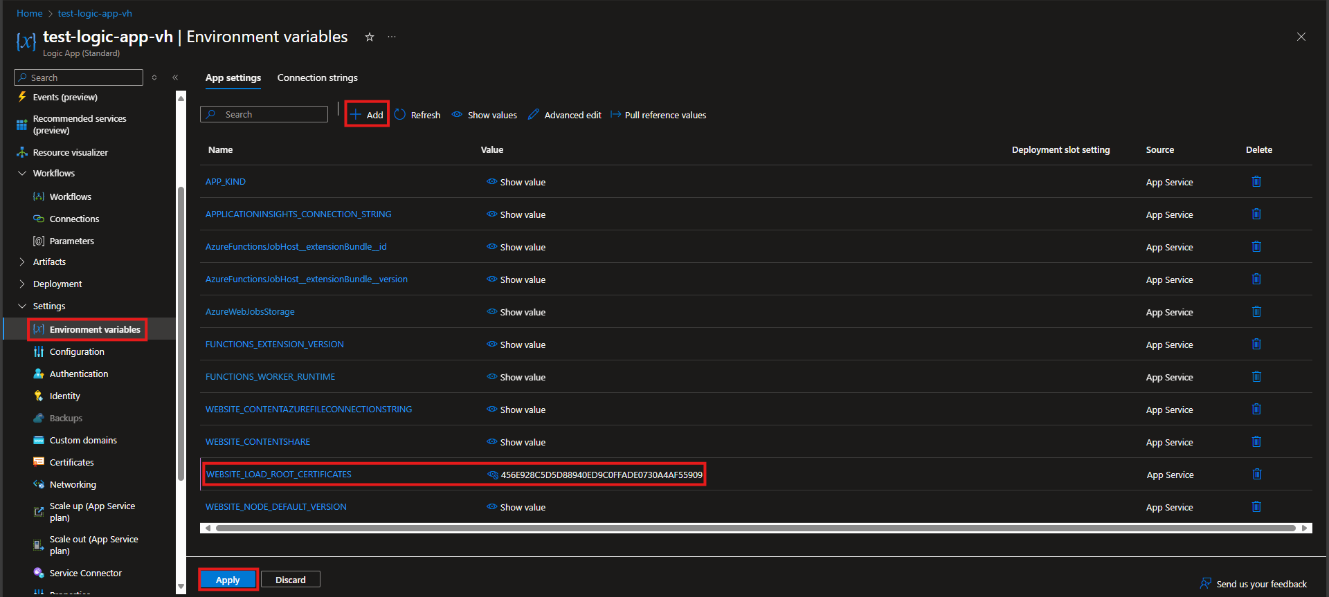 - Under Settings, select Environment variables, then select Add. The name of the environment variable to add is WEBSITE_LOAD_ROOT_CERTIFICATES and the value is going to be the thumbprint you copied. Select Apply at the bottom of the panel to save the changes and Apply again at the bottom of the list of environment variables to apply these changes. The new environment variable should take effect.