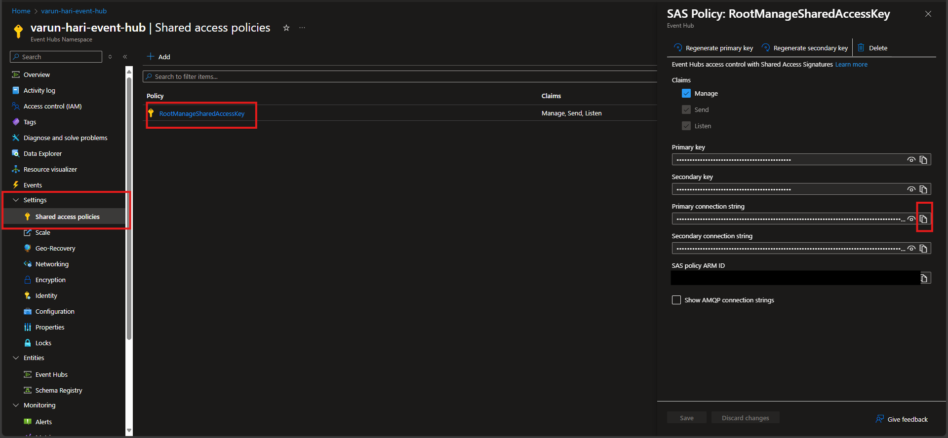 - In a separate browser tab, open the Event Hub instance that contains the log messages. Select Settings, then click on Shared access policies. Select RootManagerSharedAccessKey and click on the copy icon next to Primary connection string.