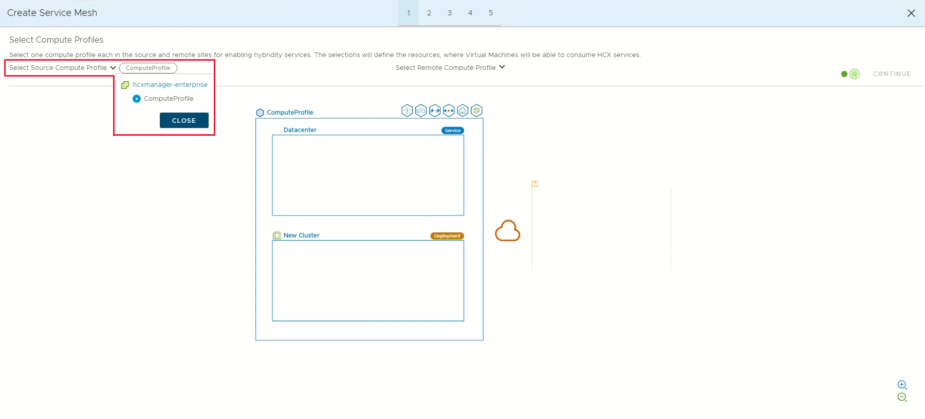 Select the source and remote compute profiles from the drop-down lists, and then select Continue.
