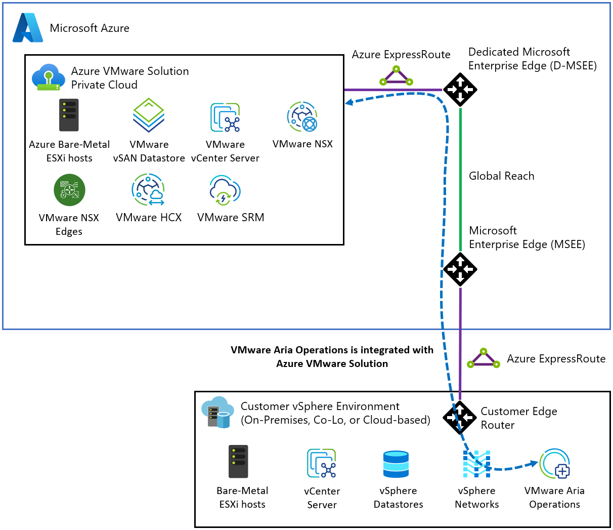 Most customers have an existing on-premises deployment of Aria Operations to manage one or more on-premises vCenter Server SSO domains. When they provision an Azure VMware Solution private cloud, they connect their on-premises environment with their private cloud using an Azure ExpressRoute or a Layer 3 VPN solution.