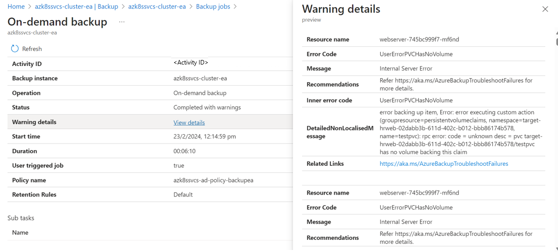 For example, if a backup job for an AKS cluster completes with the status Completed with Warnings, a restore point is created, but it does not have all the resources in the cluster backed-up as per the backup configuration. The job shows warning details, providing the issues and resources that were impacted during the operation.