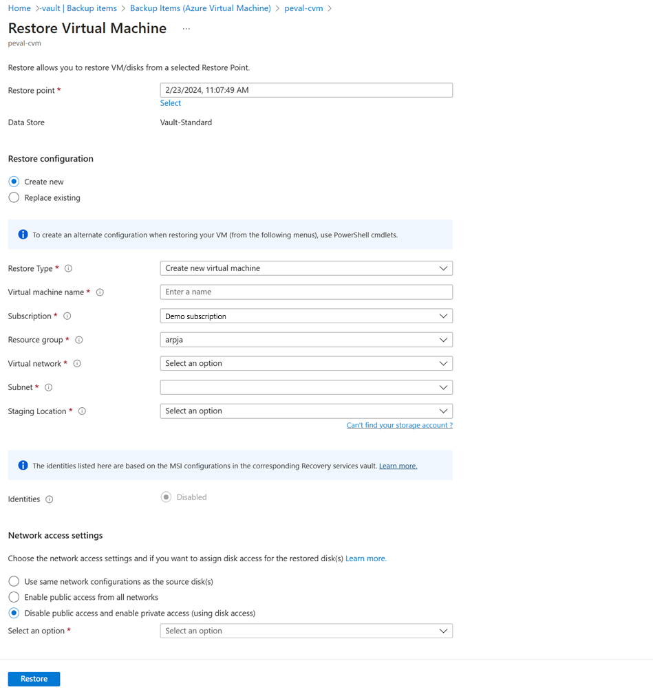 When you choose Create a new VM (or restore disks and then create a VM), the restored VM is a new resource. RBAC role assignments that were scoped to the original VM do not carry over; reassign roles on the new VM as needed.