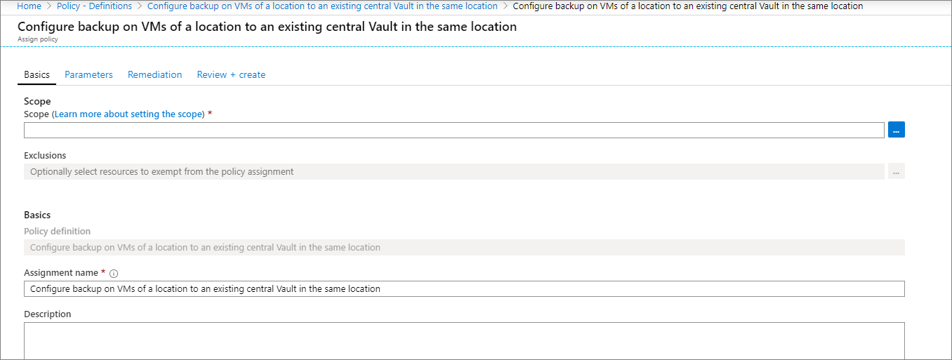 This policy enables a central backup team to configure backup for Azure Virtual Machines using an existing central Recovery Services vault located in the same subscription and region as the governed VMs. You can exclude specific VMs from the policy scope with a designated tag.