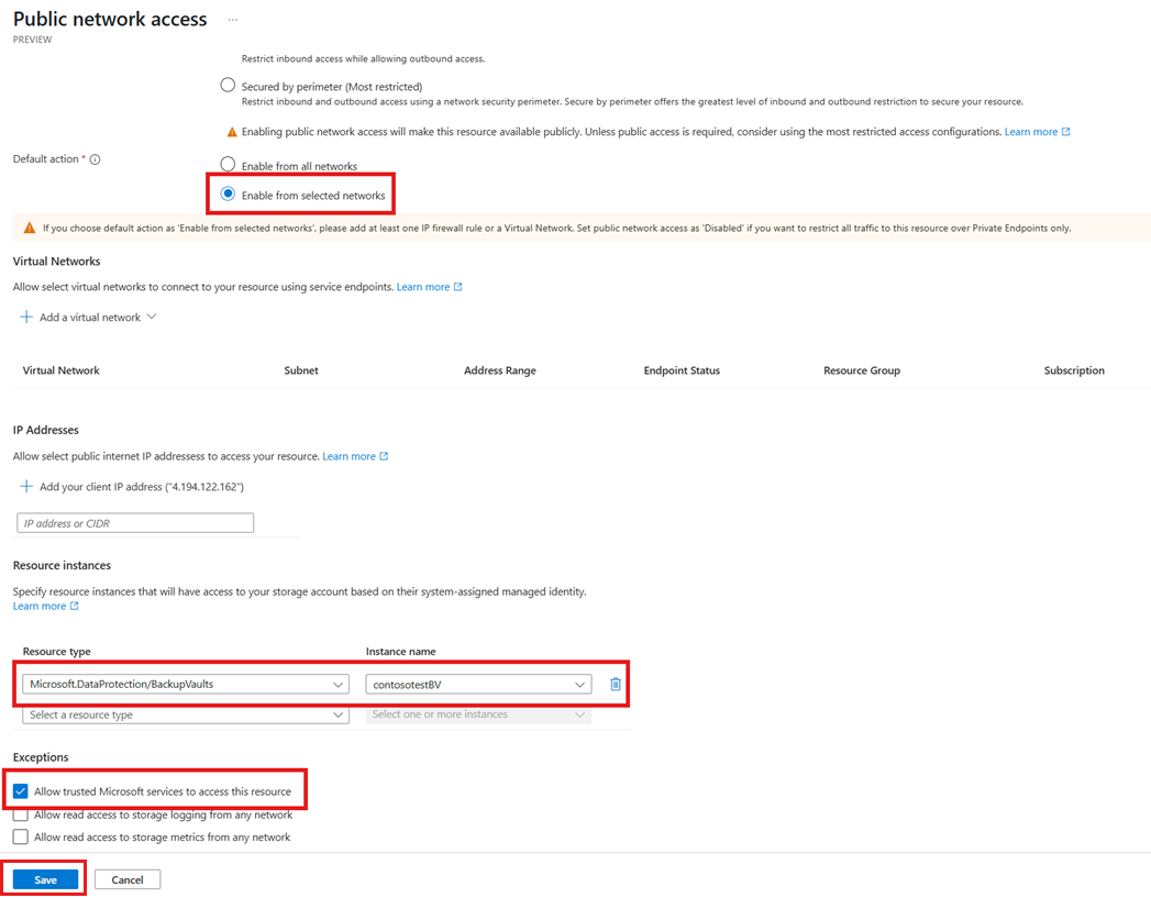 Microsoft.DataProtection/BackupVaults, and then select the Backup vault where your backup is stored.Under Exceptions, select Allow trusted Microsoft services to access this resource.