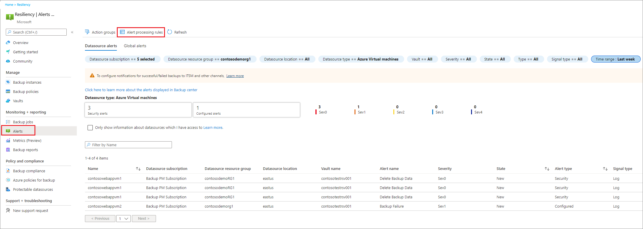In the Azure portal, go to Resiliency > Monitoring + Reporting > Alerts to create or view alert processing rules. Learn more.