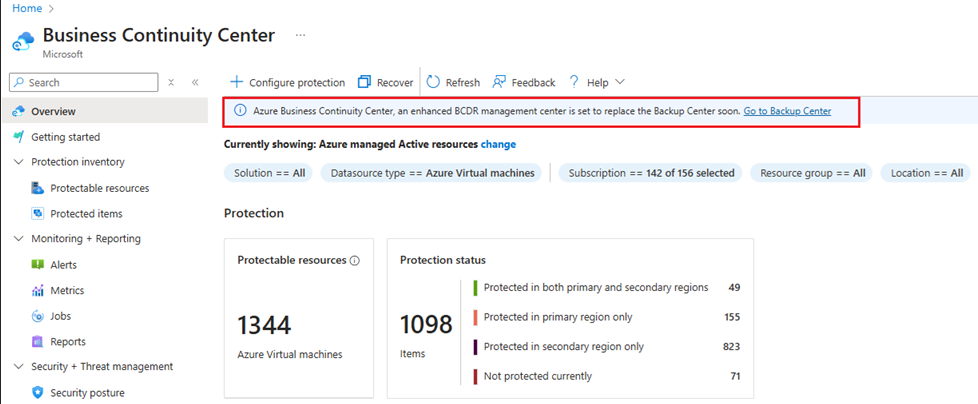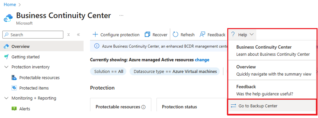 The Backup center has evolved to offer advanced BCDR management capabilities at scale. We recommend you to use Azure Business Continuity Center for comprehensive BCDR management of your protected resources across Azure Backup and Azure Site Recovery. Backup center is no longer available from Azure Portal search. You can go to Backup center from the Azure Business Continuity center Help menu. Learn about switching to Azure Business Continuity Center for your at scale BCDR management needs.
