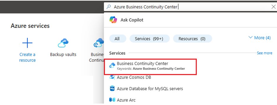 In the Azure portal, search for Azure Business Continuity Center, and then go to the Azure Business Continuity Center dashboard.