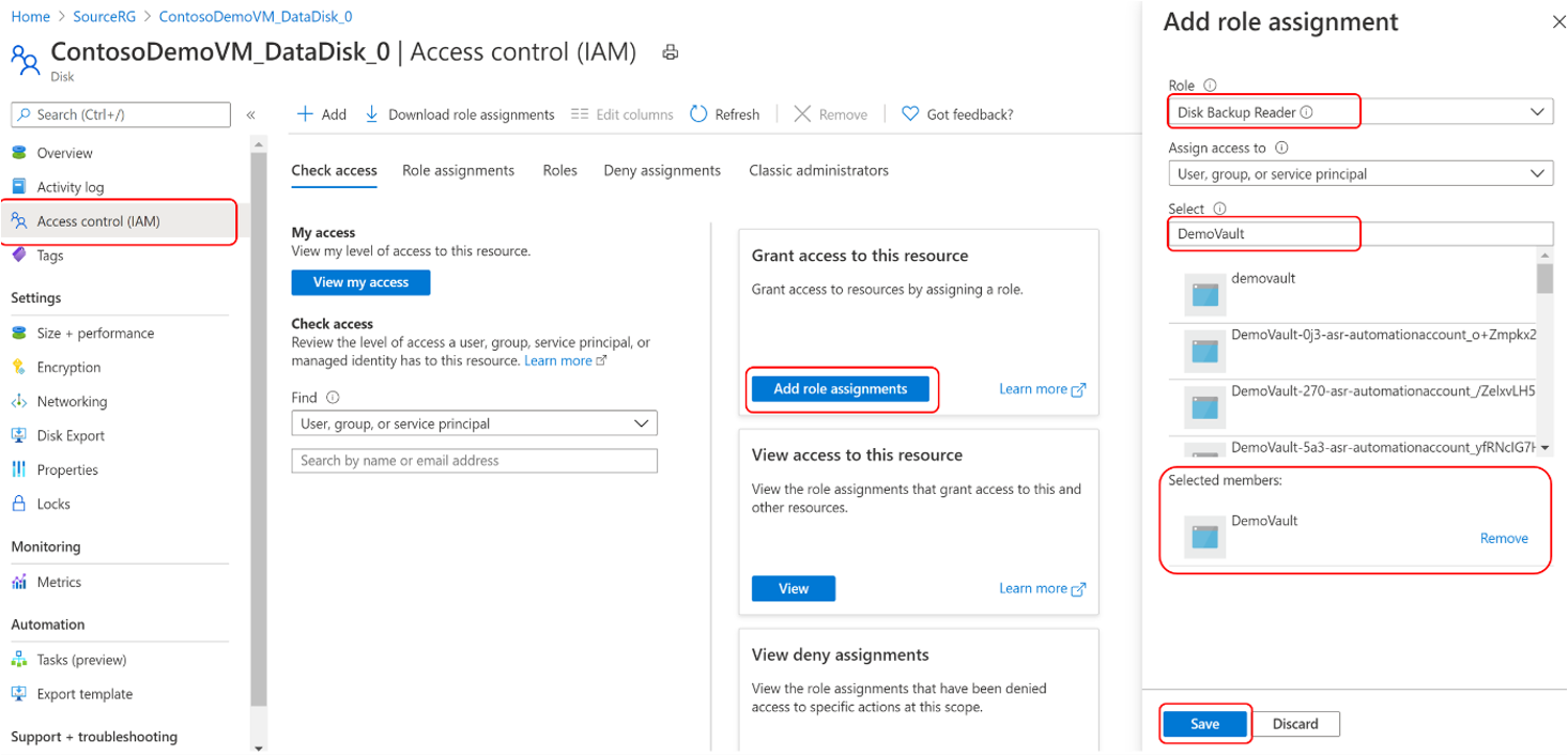 Assign the Disk Backup Reader role to Backup vault’s managed identity on the Source disk that needs to be backed up.
