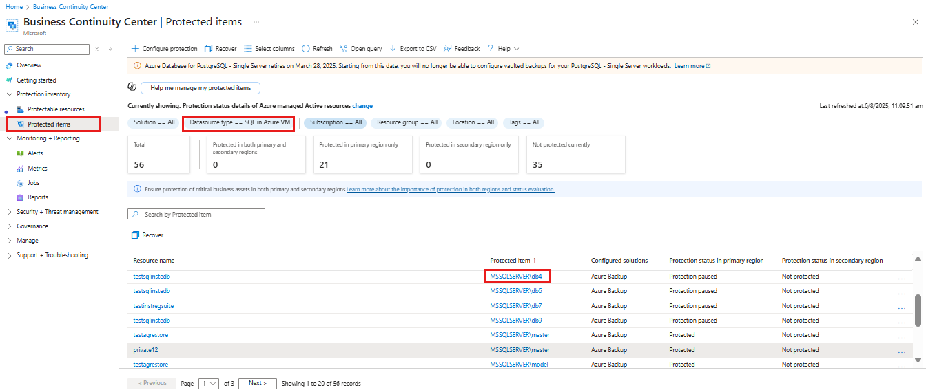 Go to Business Continuity Center and select Protection inventory > Protected items.