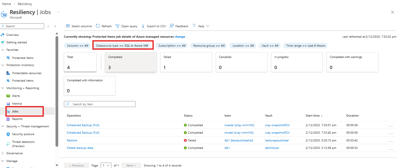 In the Azure portal, go to Resiliency > Monitoring + Reporting > Jobs.