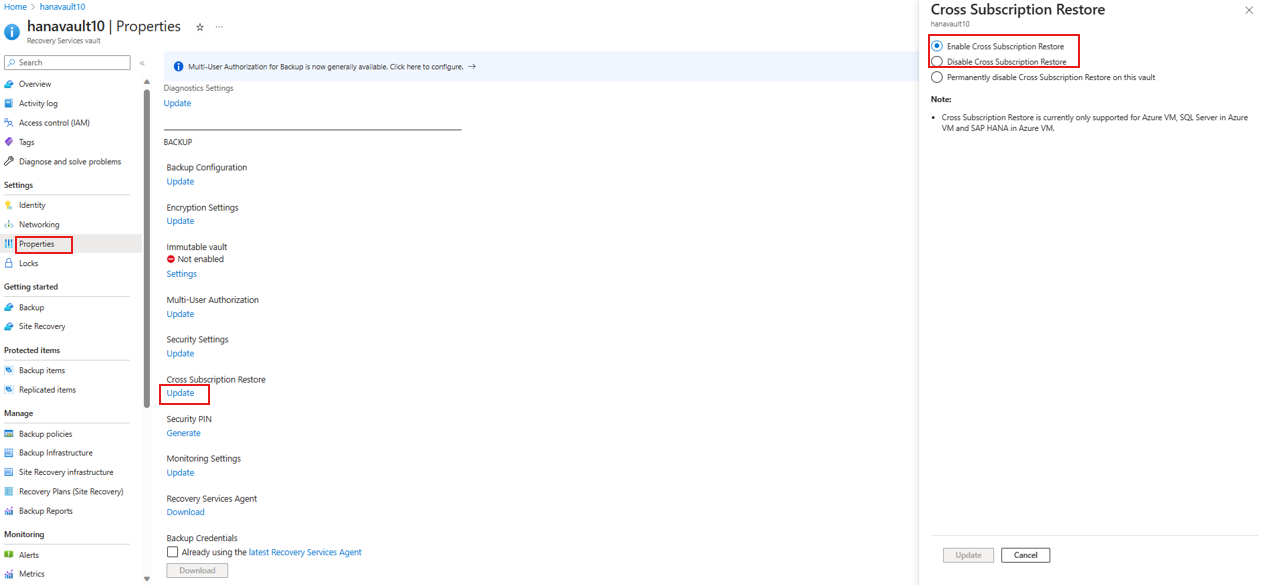 Screenshot shows how to modify the Cross Subscription Restore settings on a Recovery Services vault for HANA database.