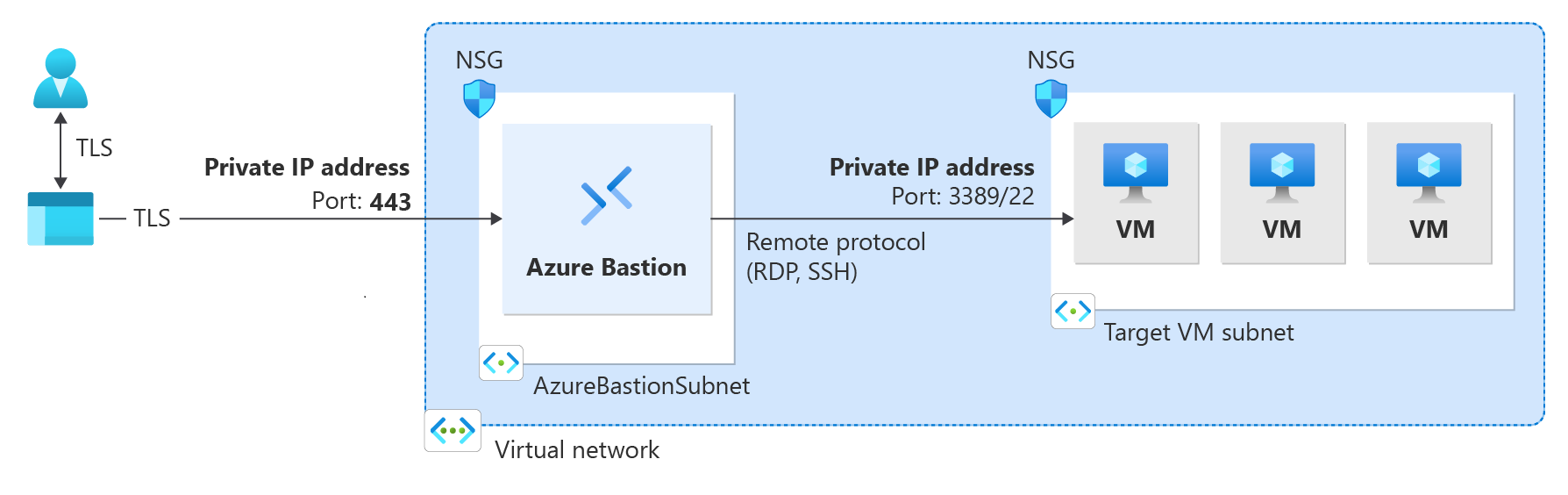 Remote Session over TLS and firewall traversal for RDP/SSH Azure Bastion uses an HTML5 based web client that is automatically streamed to your local device. Your RDP/SSH session is over TLS on port 443. This enables the traffic to traverse firewalls more securely. Bastion supports TLS 1.2. Older TLS versions aren't supported.