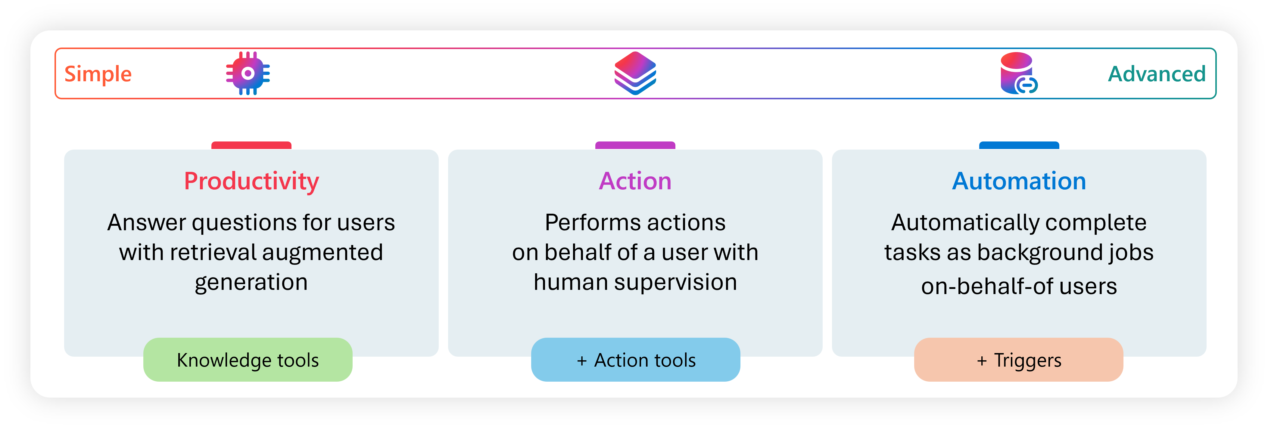 Automation agents. These agents manage complex, multi-step processes with minimal oversight. They use knowledge tools and action tools, plus triggers that determine when to run, stop, or escalate an issue. This autonomy enables scalable automation for scenarios like supply chain optimization, though it requires rigorous governance to manage the increased complexity.