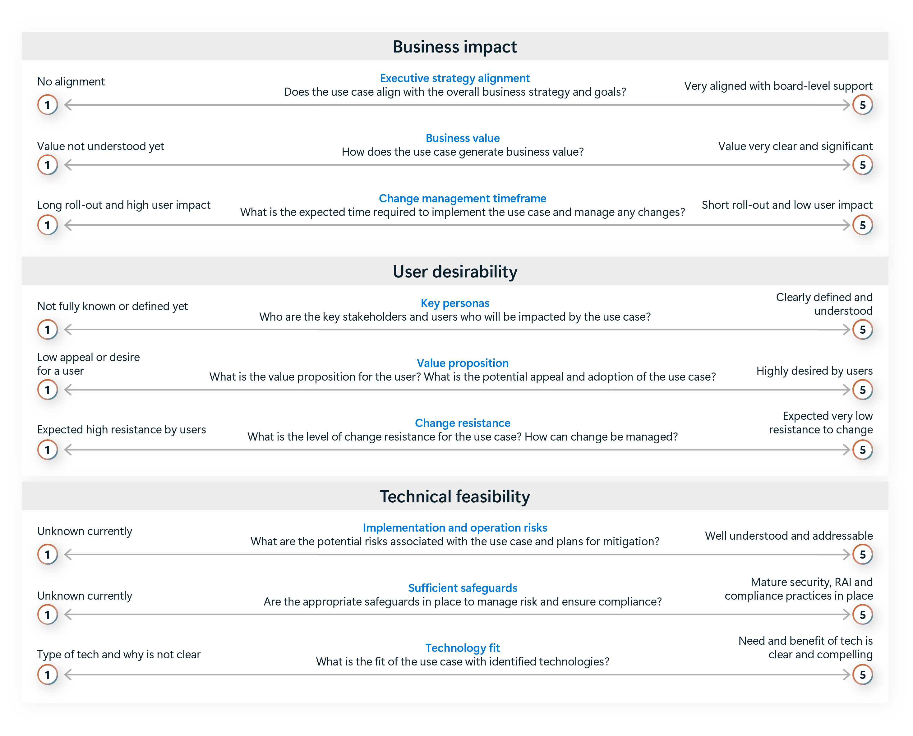 Change management timeframe: Consider the expected time and effort required to implement the use case and manage associated changes. A lengthy rollout with significant user disruption signals a challenging implementation. A short deployment cycle with minimal impact on users indicates strong feasibility and readiness.
