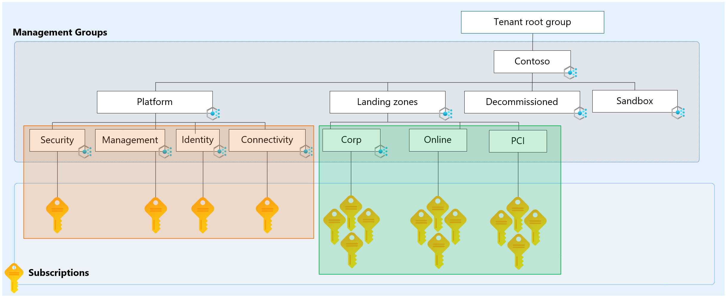 You might also want to tailor the area highlighted in orange underneath the Platform management group. The zones in this area are known as platform landing zones.
