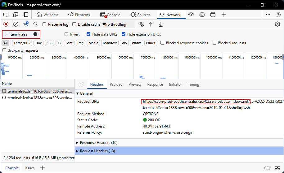 terminals?to find the request for a Cloud Shell terminal. Select the one of the request entries found by the search. In the Headers tab, find the hostname in the Request URL. The name is similar toccon-prod-<region-name>-aci-XX.servicebus.windows.net. For Azure Government Cloud, the hostname ends withservicebus.usgovcloudapi.net.The following screenshot shows the Developer Tools in Microsoft Edge for a successful request for a terminal. The hostname is