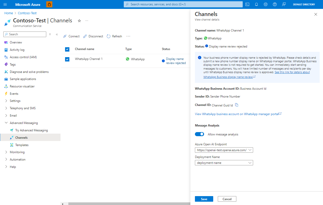 Azure Communication Services enables you to receive Message Analysis results using your own Azure OpenAI resource.