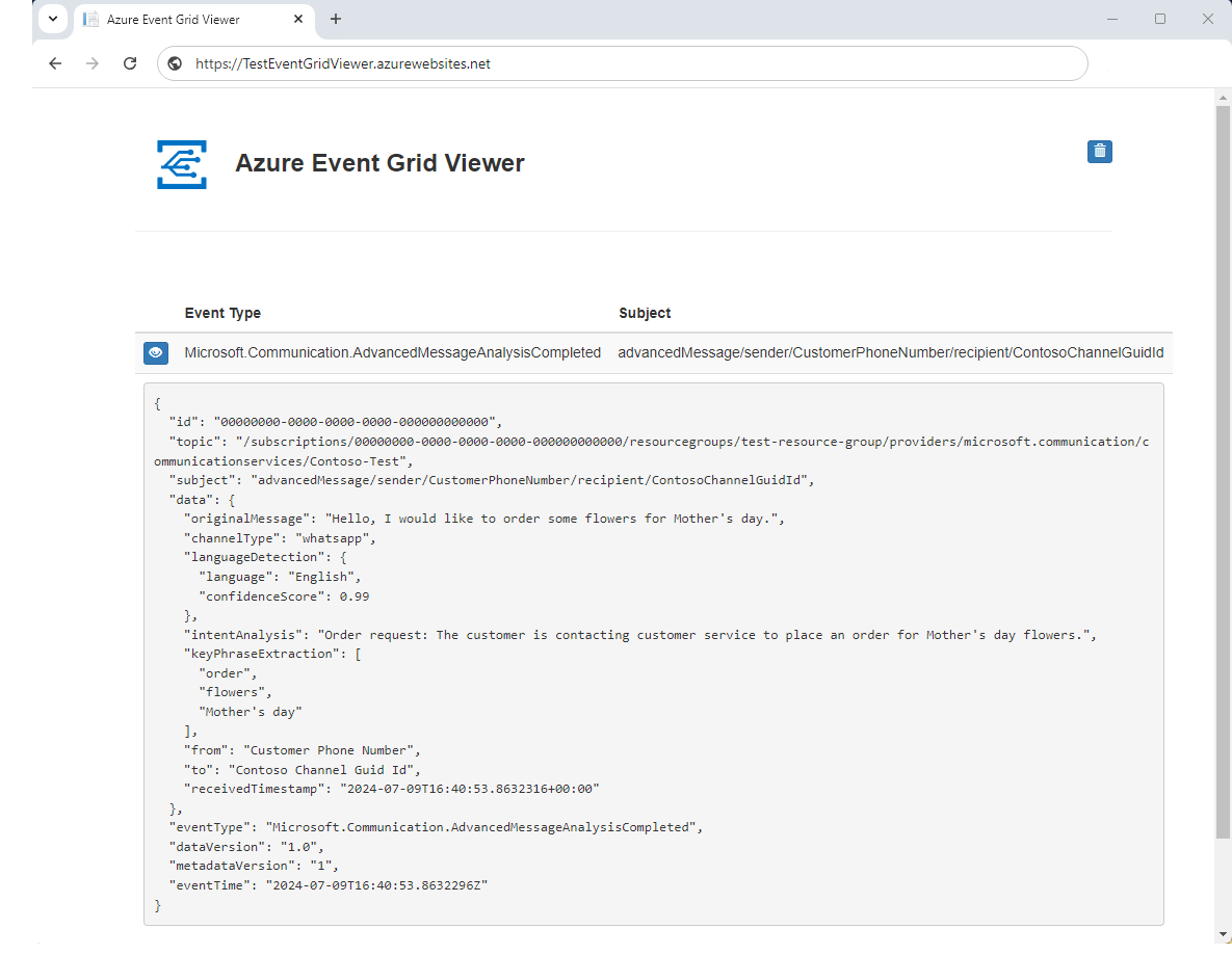 b. Receive the Message Analysis event in the Event Grid Viewer that you set up in Step 3. Details on the AdvancedMessageAnalysisCompleted event schema can be found at Azure Communication Services - Advanced Messaging events