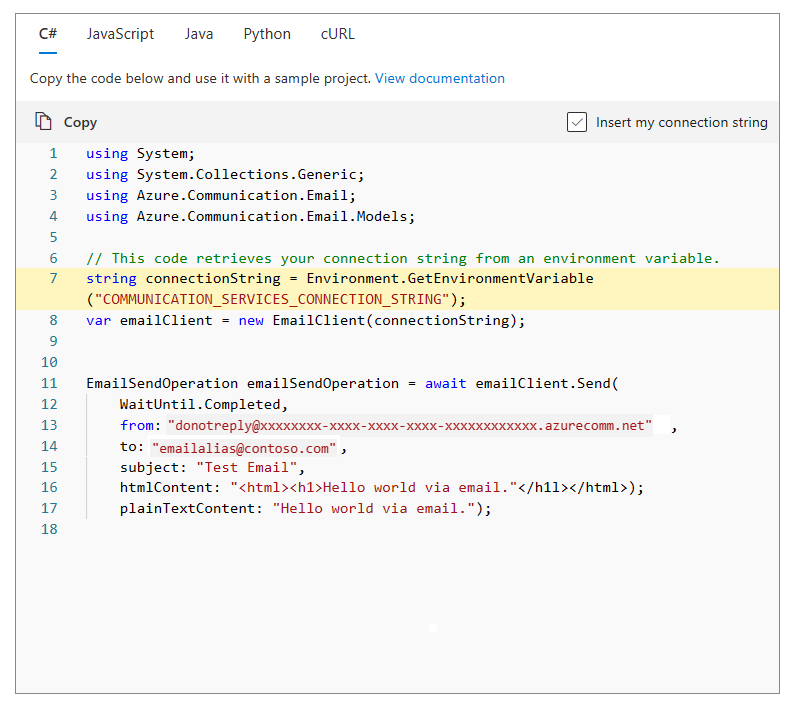 • Replace <donotreply@xxxxxxxx-xxxx-xxxx-xxxx-xxxxxxxxxxxx.azurecomm.net> with the MailFrom address of your verified domain.