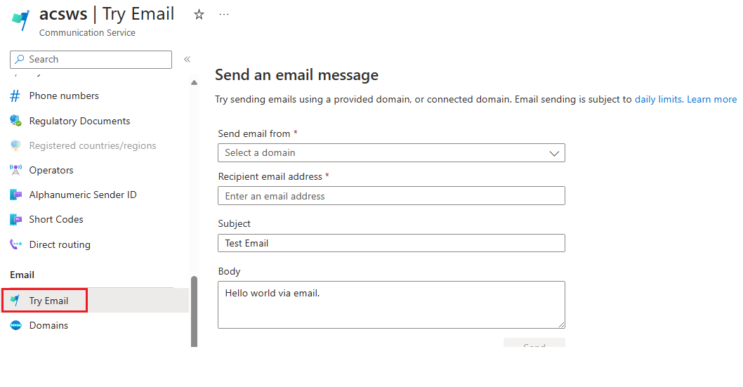Try Email helps you kick-start sending emails to the desired recipients using Azure Communication Services, and verifying the configuration for your application to send email. It also helps to jump-start your email notification development with the code snippet in your preferred choice of language.