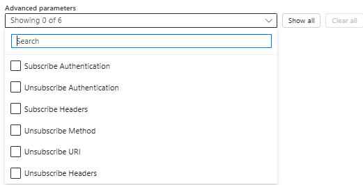 For example, if you need to use authentication, you can add the Subscribe Authentication and Unsubscribe Authentication properties. For more information about authentication types available for HTTP Webhook, see Add authentication to outbound calls.