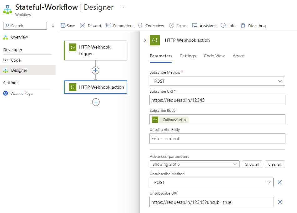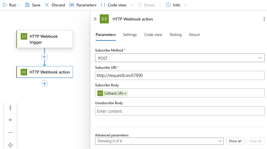 Property Required Description Subscribe Method Yes The method to use when subscribing to the target endpoint Subscribe URI Yes The URL to use for subscribing to the target endpoint Subscribe Body No Any message body to include in the subscribe request. This example includes the callback URL that uniquely identifies the subscriber, which is your logic app, by using the @listCallbackUrl()expression to retrieve your logic app's callback URL.Unsubscribe Body No An optional message body to include in the unsubscribe request