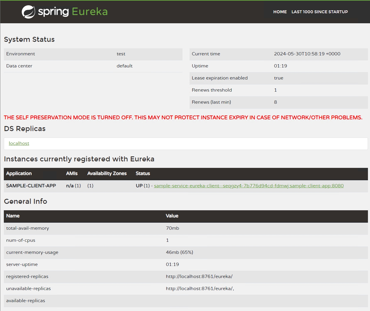 eureka.server.enable-self-preservation, set tofalse. This default configuration helps avoid times when instances aren't deleted after self-preservation is enabled. If instances are deleted too early, some requests might be directed to nonexistent instances. If you want to change this setting totrue, you can overwrite it by setting your own configurations in the Java component. - The Eureka dashboard isn't available in Azure China 21Vianet.