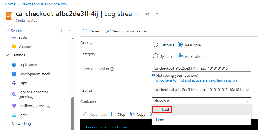 In the Container Apps dashboard, select Monitoring > Log stream.