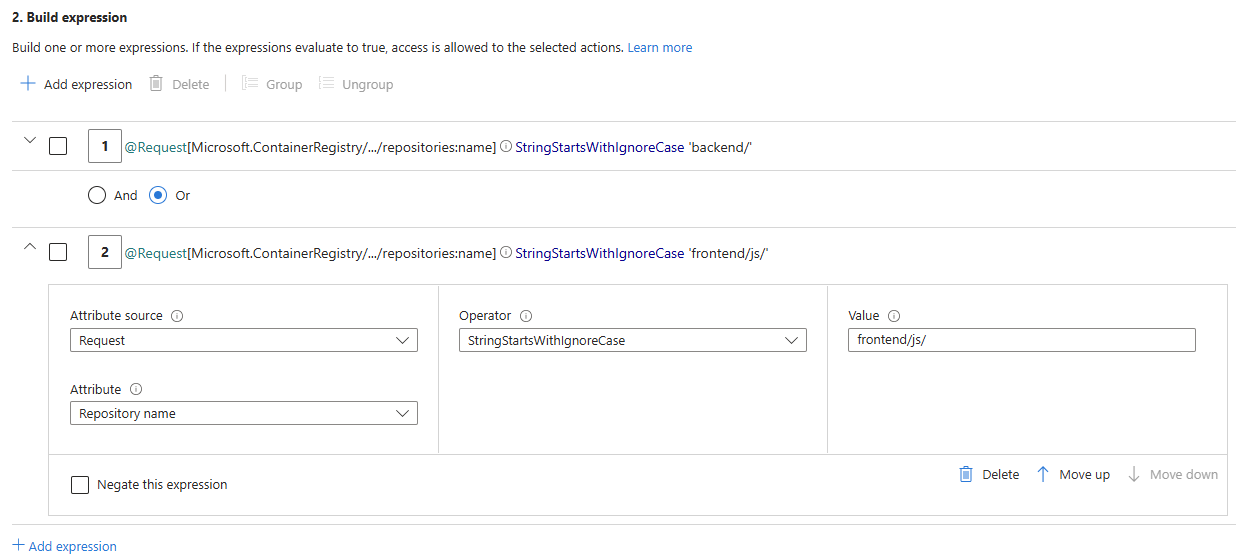By adding ABAC conditions, this role assignment lets the identity pull images, view tags, and read metadata only from the specified repositories, preventing access to other repositories in the registry.