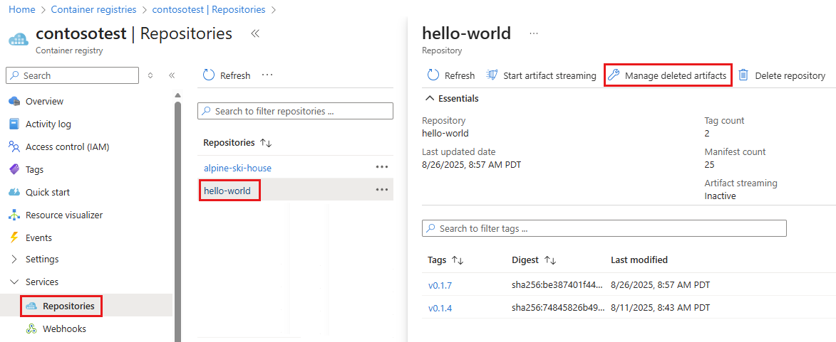 When soft delete is enabled, and you perform actions such as untagging a manifest or deleting an artifact, you can view these tags and artifacts by selecting Managed deleted artifacts before the retention period expires, as described in the next section.