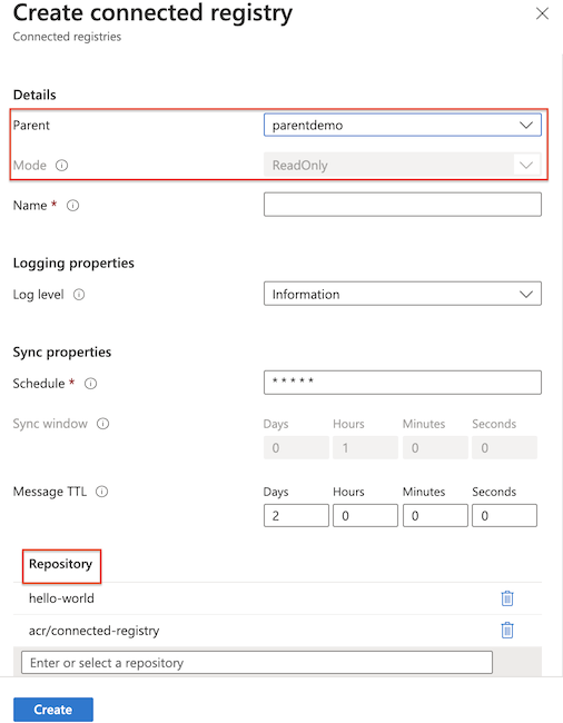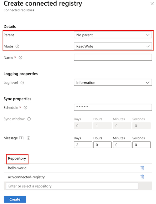 | Repositories | Select or enter the names of the repositories you imported in the previous step. The specified repositories are synchronized between the parent registry and the connected registry once deployed. |